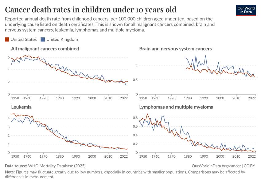 The chart below shows the decline in death rates for some common childhood cancers. You can see that childhood cancer death rates have declined greatly in the United States, especially for leukemias and lymphomas.