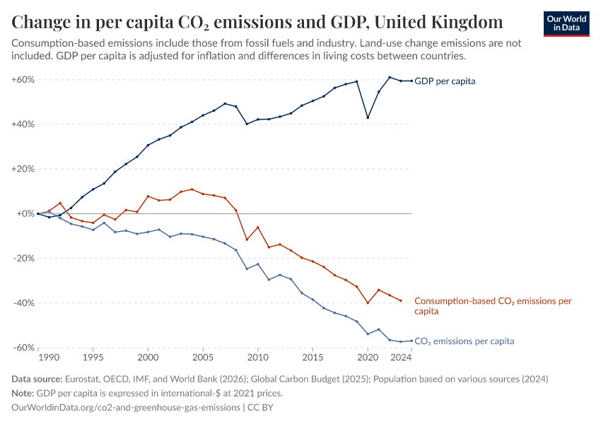 Hannah Ritchie (2021) - “Many countries have decoupled economic growth from CO₂ emissions, even if we take offshored production into account” Published online at OurWorldinData.org. Retrieved from: 'https://data-populationgrowth-discre.owid.pages.dev:8789/20260209-101631/co2-gdp-decoupling.html' [Online Resource] (archived on February 9, 2026).BibTeX citation
