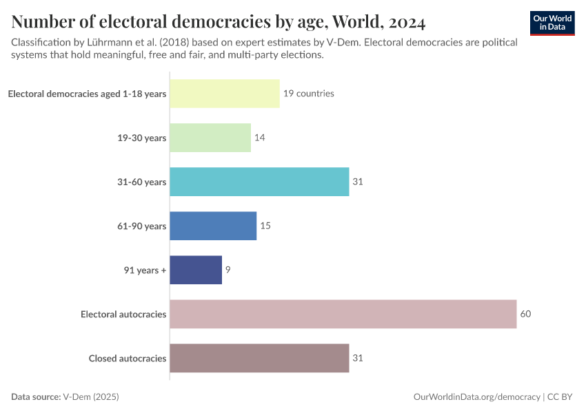 On this page, you can find data, visualizations, and writing on how democracy has spread across countries, how it differs between them, and whether we are moving towards a more democratic world.