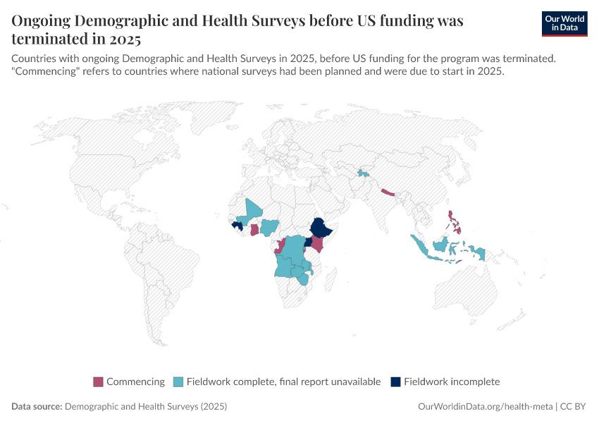 Saloni Dattani (2025) - “The Demographic and Health Surveys brought crucial data for more than 90 countries — without them, we risk darkness” Published online at OurWorldinData.org. Retrieved from: 'https://data-populationgrowth-discre.owid.pages.dev:8789/20260226-063322/demographic-health-surveys-risk.html' [Online Resource] (archived on February 26, 2026).BibTeX citation