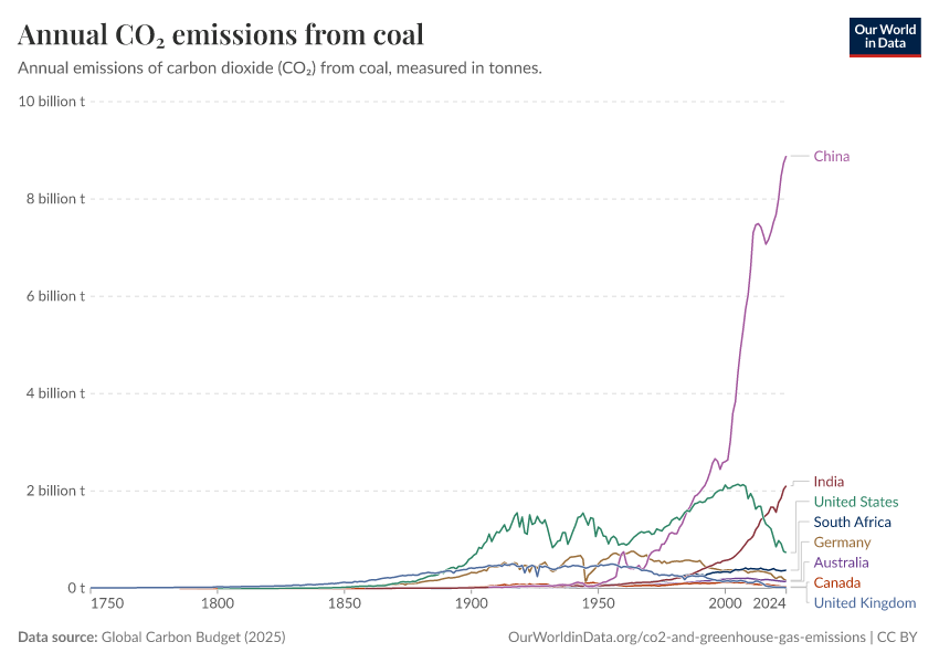 Emissions from coal have since shifted elsewhere: in recent decades we have seen a rapid rise in emissions from industrializing economies such as China, India, and South Africa.