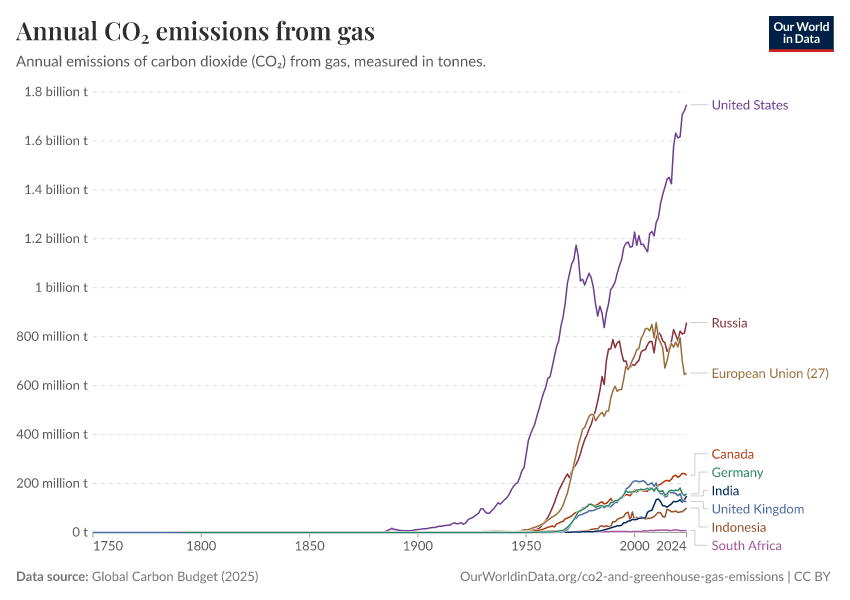 This interactive chart shows annual emissions from gas by country, over time.