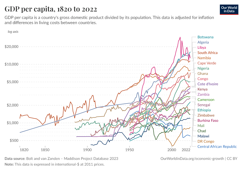 For Africa, we have fewer historical estimates. As shown in the second chart, within the Maddison Project Database, estimates prior to 1950 are only available for a small number of countries.