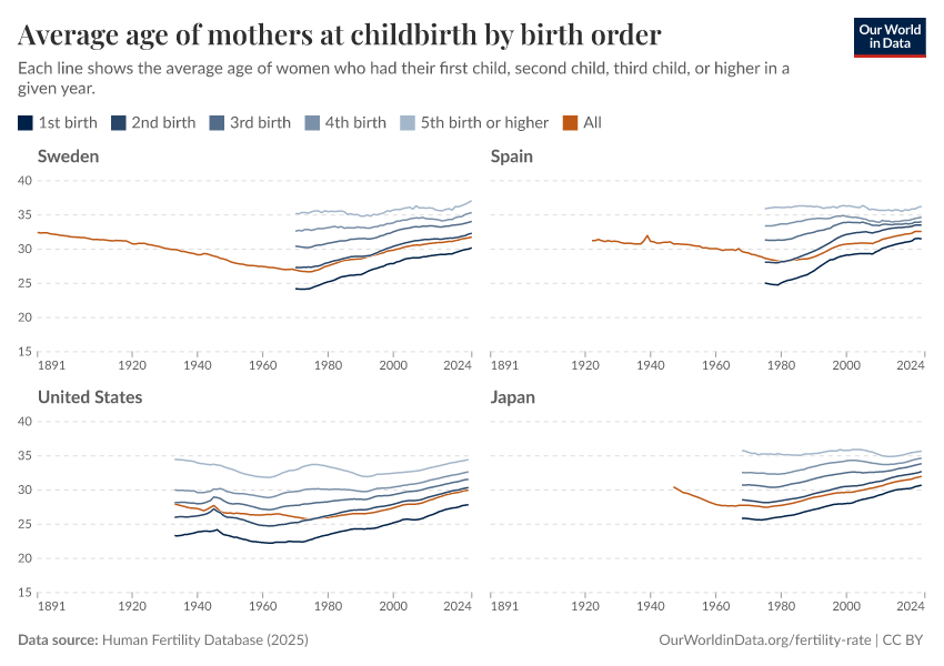 By looking at these additional metrics, we can better understand when, why, and how parents have children — and what this means for individuals and societies. The following section highlights the key insights on this topic. Below are links to our in-depth articles, which explore several topics in more detail.