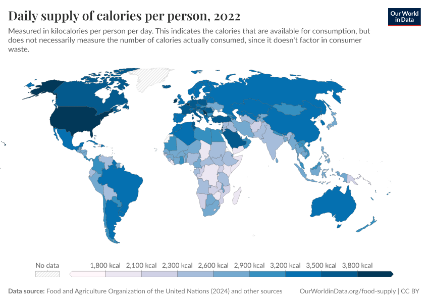 In this interactive map, we see the differences in how many calories each person gets every day in different countries.