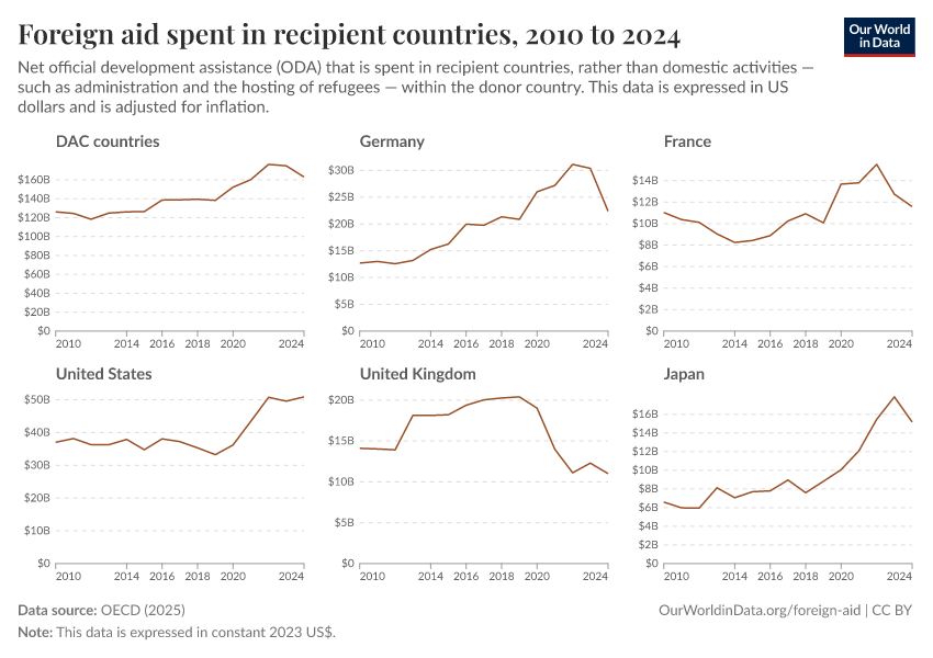 Simon van Teutem, Hannah Ritchie, and Pablo Arriagada (2025) - “How much foreign aid is spent domestically rather than overseas?” Published online at OurWorldinData.org. Retrieved from: 'https://data-populationgrowth-discre.owid.pages.dev:8789/20260223-070107/foreign-aid-domestic-overseas.html' [Online Resource] (archived on February 23, 2026).BibTeX citation
