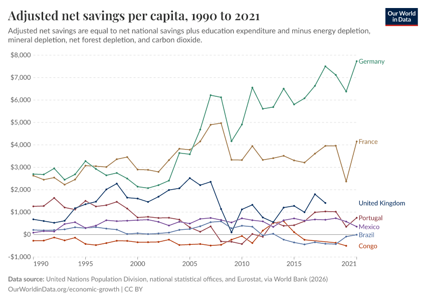 “Data Page: Adjusted net savings per capita”. Our World in Data (2026). Data adapted from United Nations Population Division, national statistical offices, and Eurostat, via World Bank. Retrieved from https://data-populationgrowth-discre.owid.pages.dev:8789/20260202-181317/grapher/adjusted-net-savings-per-person.html [online resource] (archived on February 2, 2026).How to cite this data