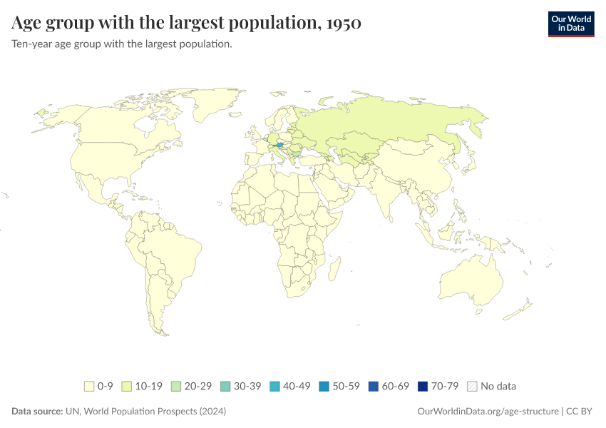 “Data Page: Ten year age-group with the highest population”. Our World in Data (2026). Data adapted from United Nations. Retrieved from https://data-populationgrowth-discre.owid.pages.dev:8789/20260225-014904/grapher/age-group-with-the-largest-population.html [online resource] (archived on February 25, 2026).How to cite this data