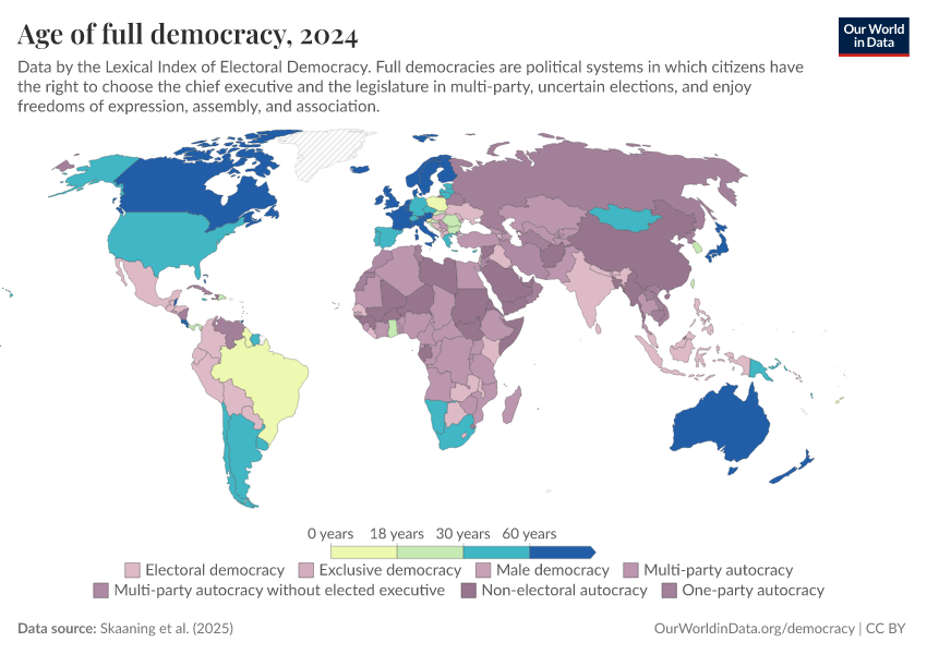 Skaaning et al. (2025) – processed by Our World in Data. “Age of full democracy” [dataset]. Skaaning et al., “Lexical Index of Electoral Democracy (LIED) v6.8” [original data]. Retrieved February 27, 2026 from https://data-populationgrowth-discre.owid.pages.dev:8789/20260119-065148/grapher/age-of-full-democracy.html (archived on January 19, 2026).