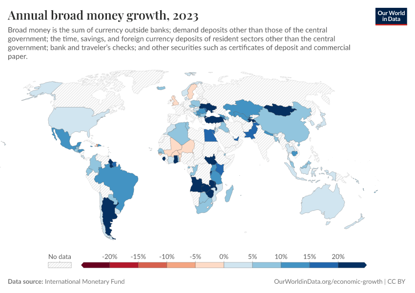 International Monetary Fund – processed by Our World in Data. “Annual broad money growth” [dataset]. International Monetary Fund, “International Monetary Fund, International Financial Statistics and data files.” [original data]. Retrieved February 27, 2026 from https://data-populationgrowth-discre.owid.pages.dev:8789/20251120-211749/grapher/annual-broad-money-growth.html (archived on November 20, 2025).