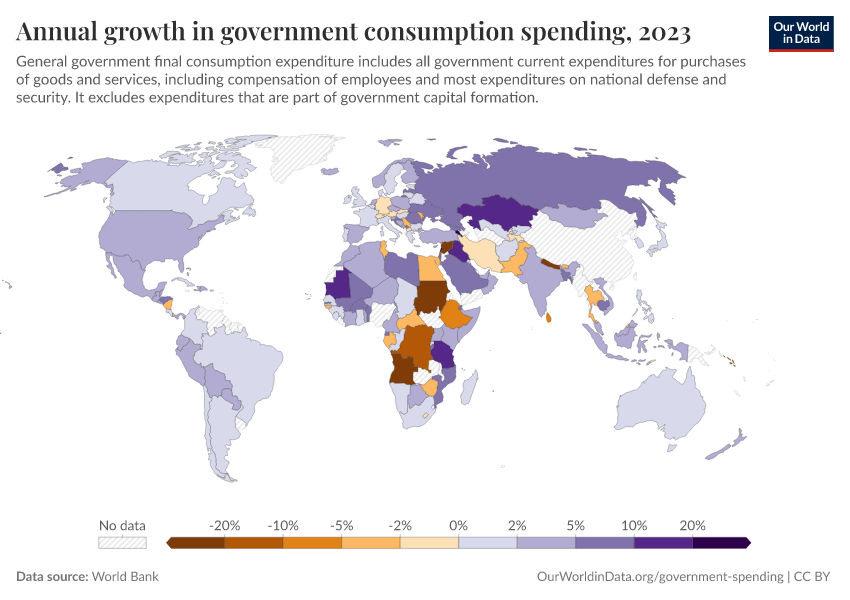 “Data Page: Annual growth in government consumption spending”. Our World in Data (2026). Data adapted from World Bank. Retrieved from https://data-populationgrowth-discre.owid.pages.dev:8789/20260130-180113/grapher/annual-growth-of-general-government-final-consumption-expenditure.html [online resource] (archived on January 30, 2026).How to cite this data