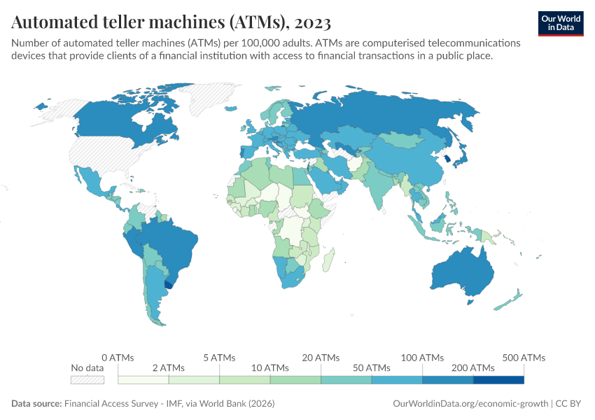 “Data Page: Automated teller machines (ATMs)”. Our World in Data (2026). Data adapted from Financial Access Survey - IMF, via World Bank. Retrieved from https://data-populationgrowth-discre.owid.pages.dev:8789/20260202-181317/grapher/automated-teller-machines-atms-per-100000-adults.html [online resource] (archived on February 2, 2026).How to cite this data