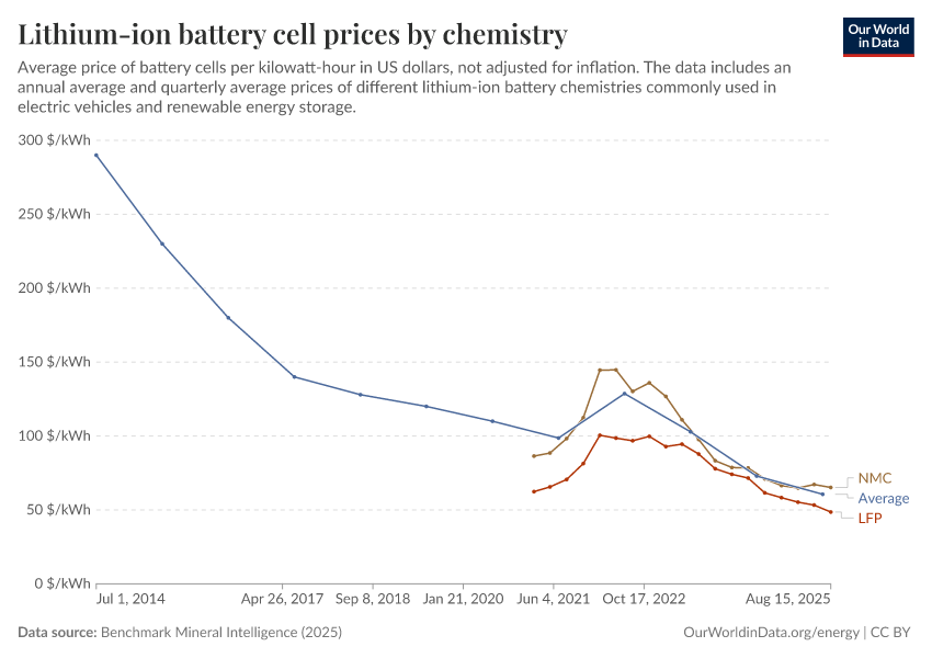 Benchmark Mineral Intelligence (2025) – with minor processing by Our World in Data. “Lithium-ion battery cell prices by chemistry” [dataset]. Benchmark Mineral Intelligence, “Lithium-ion battery prices”; Benchmark Mineral Intelligence, “Battery prices by chemistry” [original data]. Retrieved February 27, 2026 from https://data-populationgrowth-discre.owid.pages.dev:8789/20260108-171008/grapher/average-battery-cell-price.html (archived on January 8, 2026).