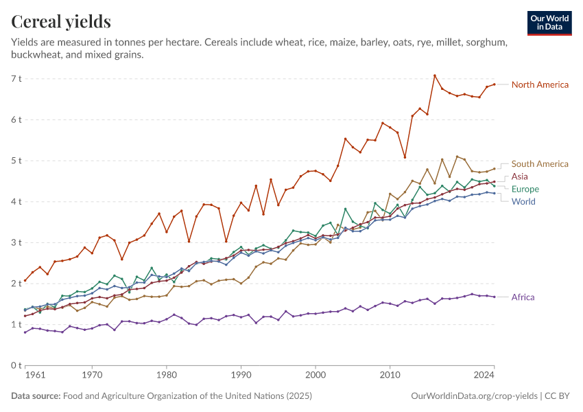 Food and Agriculture Organization of the United Nations (2025) – with major processing by Our World in Data. “Cereal yields – UN FAO” [dataset]. Food and Agriculture Organization of the United Nations, “Production: Crops and livestock products” [original data]. Retrieved February 27, 2026 from https://data-populationgrowth-discre.owid.pages.dev:8789/20260116-143329/grapher/cereal-yield.html (archived on January 16, 2026).