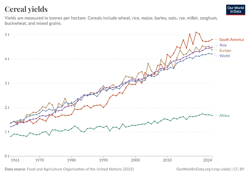 Food and Agriculture Organization of the United Nations (2025) – with major processing by Our World in Data. “Cereal yields – UN FAO” [dataset]. Food and Agriculture Organization of the United Nations, “Production: Crops and livestock products” [original data]. Retrieved February 27, 2026 from https://data-populationgrowth-discre.owid.pages.dev:8789/20260116-143329/grapher/cereal-yield.html (archived on January 16, 2026).
