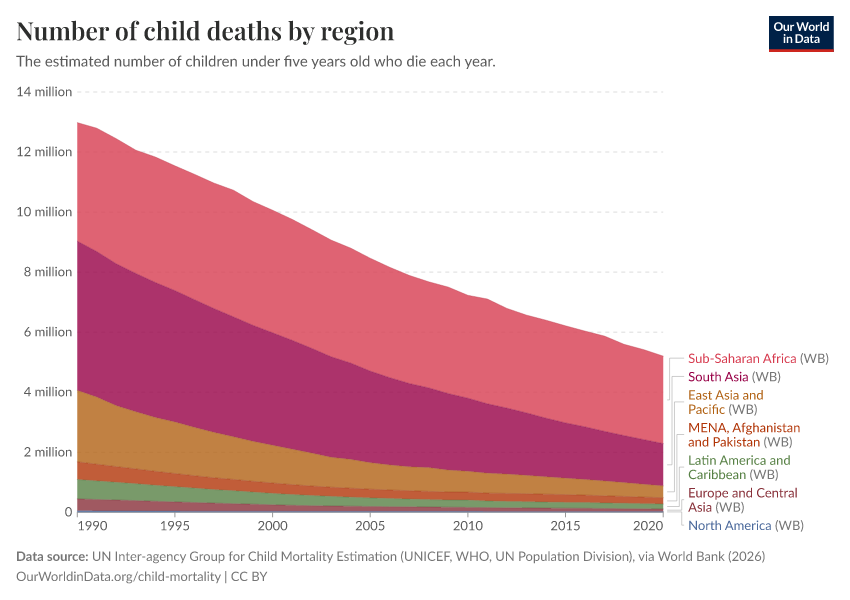 UN Inter-agency Group for Child Mortality Estimation (UNICEF, WHO, UN Population Division), via World Bank (2026) – processed by Our World in Data. “Number of child deaths by region” [dataset]. UN Inter-agency Group for Child Mortality Estimation (UNICEF, WHO, UN Population Division), via World Bank, “World Development Indicators 125” [original data]. Retrieved February 27, 2026 from https://data-populationgrowth-discre.owid.pages.dev:8789/20260202-180243/grapher/child-deaths-igme-data.html (archived on February 2, 2026).