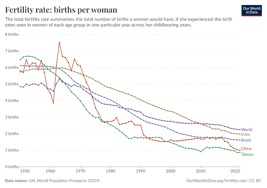 “Data Page: Fertility rate, total”. Our World in Data (2026). Data adapted from United Nations. Retrieved from https://data-populationgrowth-discre.owid.pages.dev:8789/20260225-004721/grapher/children-per-woman-un.html [online resource] (archived on February 25, 2026).How to cite this data