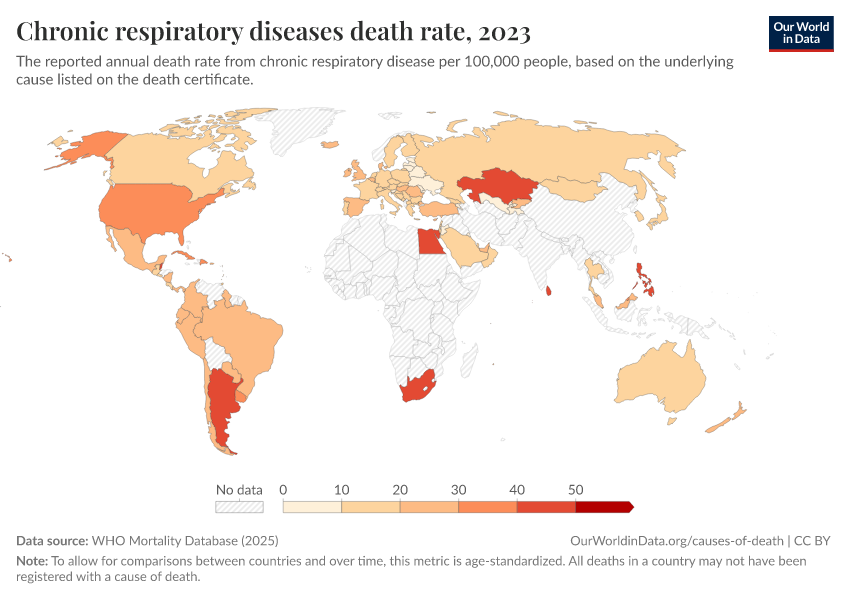 “Data Page: Chronic respiratory diseases death rate”, part of the following publication: Saloni Dattani, Fiona Spooner, Hannah Ritchie, and Max Roser (2023) - “Causes of Death”. Data adapted from WHO Mortality Database. Retrieved from https://data-populationgrowth-discre.owid.pages.dev:8789/20250909-093708/grapher/chronic-respiratory-diseases-death-rate-who-mdb.html [online resource] (archived on September 9, 2025).How to cite this data