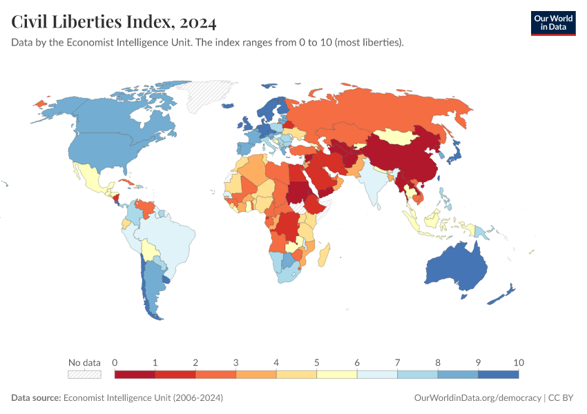 Economist Intelligence Unit (2006-2024) – processed by Our World in Data. “Civil Liberties Index” [dataset]. Economist Intelligence Unit, “Democracy Index 2021: The China challenge”; Economist Intelligence Unit, “Democracy Index 2022: Frontline democracy and the battle for Ukraine”; Economist Intelligence Unit, “Democracy Index 2023: Age of Conflict”; Economist Intelligence Unit, “Democracy Index 2024: What's wrong with representative democracy?”; Gapminder, “Democracy Index v4”; Various sources, “Population” [original data]. Retrieved February 27, 2026 from https://data-populationgrowth-discre.owid.pages.dev:8789/20260119-070102/grapher/civil-liberties-index-eiu.html (archived on January 19, 2026).