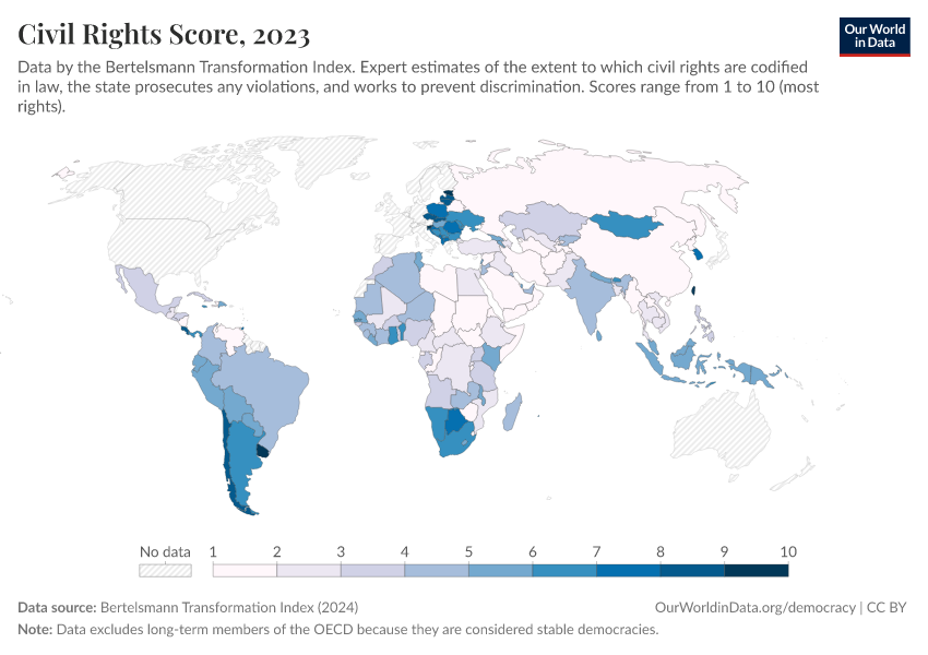 “Data Page: Civil Rights Score”, part of the following publication: Bastian Herre, Lucas Rodés-Guirao, and Esteban Ortiz-Ospina (2013) - “Democracy”. Data adapted from Bertelsmann Transformation Index. Retrieved from https://data-populationgrowth-discre.owid.pages.dev:8789/20260204-165456/grapher/civil-rights-score-bti.html [online resource] (archived on February 4, 2026).How to cite this data