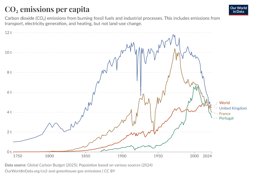 “Data Page: CO₂ emissions per capita”, part of the following publication: Hannah Ritchie, Pablo Rosado, and Max Roser (2023) - “CO₂ and Greenhouse Gas Emissions”. Data adapted from Global Carbon Project, Various sources. Retrieved from https://data-populationgrowth-discre.owid.pages.dev:8789/20260119-070102/grapher/co-emissions-per-capita.html [online resource] (archived on January 19, 2026).How to cite this data