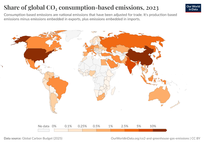 “Data Page: Share of global CO₂ consumption-based emissions”, part of the following publication: Hannah Ritchie, Pablo Rosado, and Max Roser (2023) - “CO₂ and Greenhouse Gas Emissions”. Data adapted from Global Carbon Project. Retrieved from https://data-populationgrowth-discre.owid.pages.dev:8789/20260119-070102/grapher/co2-consumption-share.html [online resource] (archived on January 19, 2026).How to cite this data