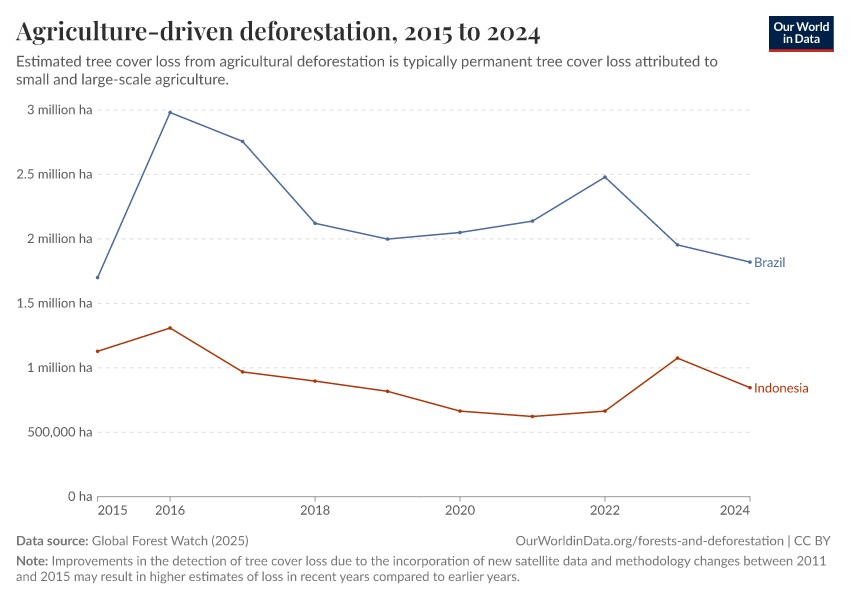 Global Forest Watch (2025) – with major processing by Our World in Data. “Agriculture-driven deforestation” [dataset]. Global Forest Watch, “Tree Cover Loss by Dominant Driver” [original data]. Retrieved February 27, 2026 from https://data-populationgrowth-discre.owid.pages.dev:8789/20260119-065148/grapher/commodity-driven-deforestation.html (archived on January 19, 2026).