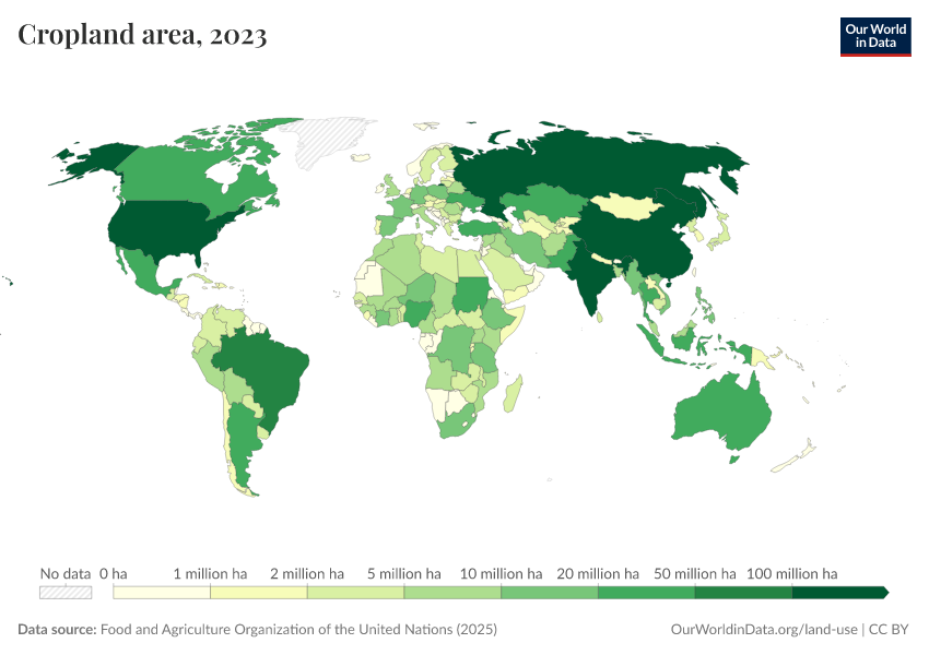 “Data Page: Cropland area”, part of the following publication: Hannah Ritchie, Pablo Rosado, and Max Roser (2023) - “Agricultural Production”. Data adapted from Food and Agriculture Organization of the United Nations. Retrieved from https://data-populationgrowth-discre.owid.pages.dev:8789/20260119-235736/grapher/cropland-area.html [online resource] (archived on January 19, 2026).How to cite this data