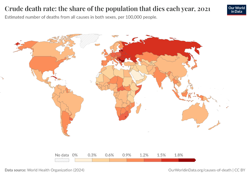 World Health Organization (2024) – with major processing by Our World in Data. “Crude death rate: the share of the population that dies each year” [dataset]. World Health Organization, “Global Health Estimates” [original data]. Retrieved February 27, 2026 from https://data-populationgrowth-discre.owid.pages.dev:8789/20250909-093708/grapher/crude-death-rate-the-share-of-the-population-that-dies-each-year-who.html (archived on September 9, 2025).