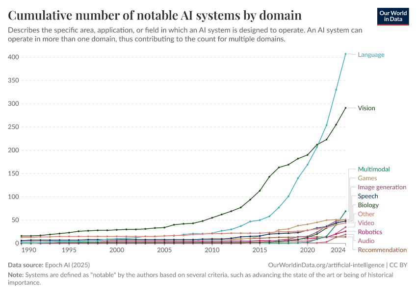 Epoch AI (2025) – with major processing by Our World in Data. “Cumulative number of notable AI systems by domain” [dataset]. Epoch AI, “Parameter, Compute and Data Trends in Machine Learning” [original data]. Retrieved February 27, 2026 from https://data-populationgrowth-discre.owid.pages.dev:8789/20260126-094752/grapher/cumulative-number-of-notable-ai-systems-by-domain.html (archived on January 26, 2026).