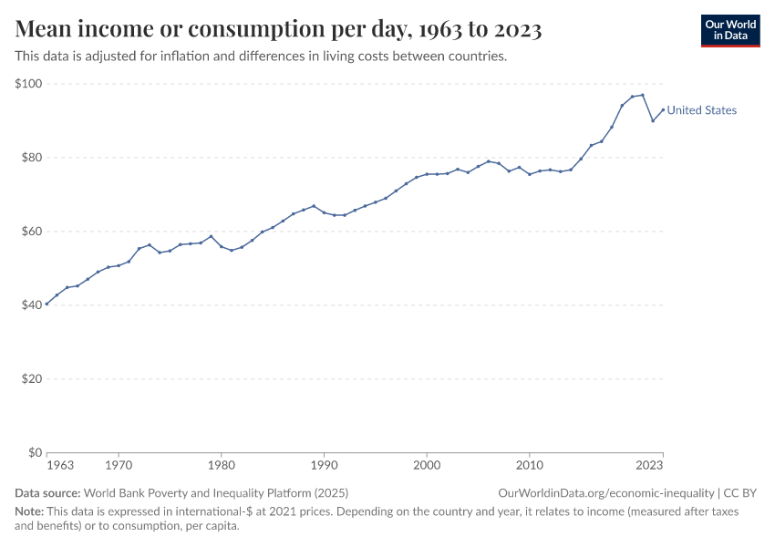 “Data Page: Mean income or consumption per day”, part of the following publication: Joe Hasell, Bertha Rohenkohl, Pablo Arriagada, Esteban Ortiz-Ospina, and Max Roser (2022) - “Poverty”. Data adapted from World Bank Poverty and Inequality Platform. Retrieved from https://data-populationgrowth-discre.owid.pages.dev:8789/20260127-114142/grapher/daily-mean-income.html [online resource] (archived on January 27, 2026).How to cite this data