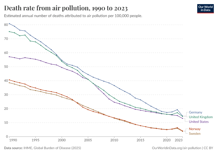 IHME, Global Burden of Disease (2025) – with major processing by Our World in Data. “Death rate from air pollution” [dataset]. IHME, Global Burden of Disease, “Global Burden of Disease - Risk Factors - Deaths” [original data]. Retrieved February 27, 2026 from https://data-populationgrowth-discre.owid.pages.dev:8789/20260213-112438/grapher/death-rate-from-air-pollution-per-100000.html (archived on February 13, 2026).