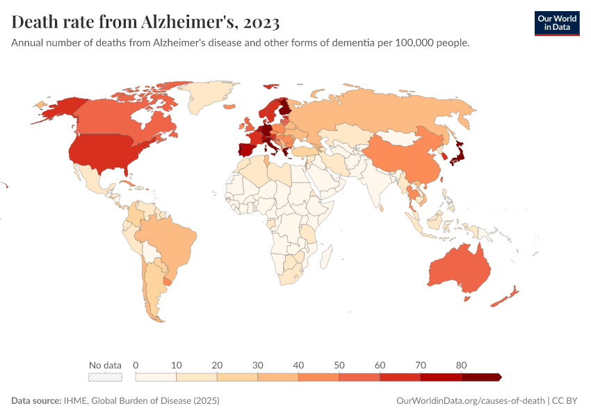 IHME, Global Burden of Disease (2025) – with major processing by Our World in Data. “Death rate from Alzheimer's” [dataset]. IHME, Global Burden of Disease, “Global Burden of Disease - Deaths” [original data]. Retrieved February 27, 2026 from https://data-populationgrowth-discre.owid.pages.dev:8789/20260211-174736/grapher/death-rate-from-alzheimers-other-dementias-gbd.html (archived on February 11, 2026).
