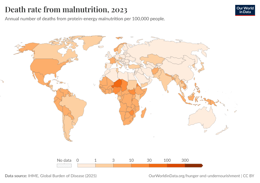 IHME, Global Burden of Disease (2025) – with major processing by Our World in Data. “Death rate from malnutrition” [dataset]. IHME, Global Burden of Disease, “Global Burden of Disease - Deaths” [original data]. Retrieved February 27, 2026 from https://data-populationgrowth-discre.owid.pages.dev:8789/20260211-174736/grapher/death-rate-from-malnutrition.html (archived on February 11, 2026).