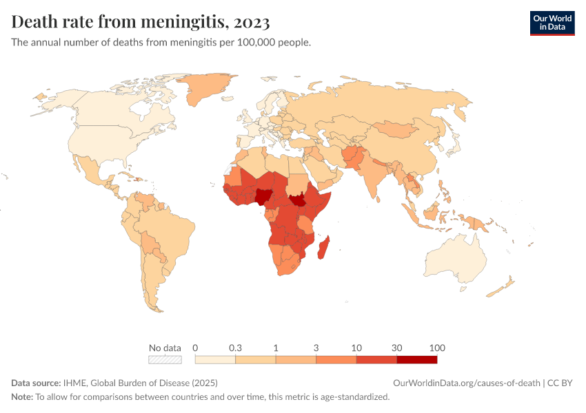 “Data Page: Death rate from meningitis”, part of the following publication: Esteban Ortiz-Ospina and Max Roser (2016) - “Global Health”. Data adapted from IHME, Global Burden of Disease. Retrieved from https://data-populationgrowth-discre.owid.pages.dev:8789/20260211-174736/grapher/death-rate-from-meningitis.html [online resource] (archived on February 11, 2026).How to cite this data