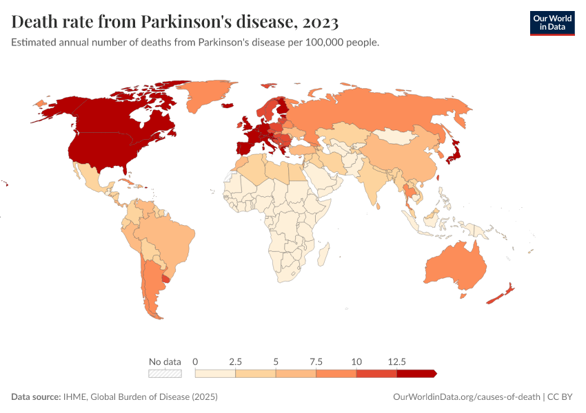 “Data Page: Death rate from Parkinson's disease”, part of the following publication: Esteban Ortiz-Ospina and Max Roser (2016) - “Global Health”. Data adapted from IHME, Global Burden of Disease. Retrieved from https://data-populationgrowth-discre.owid.pages.dev:8789/20260211-174736/grapher/death-rate-from-parkinsons-disease-gbd.html [online resource] (archived on February 11, 2026).How to cite this data
