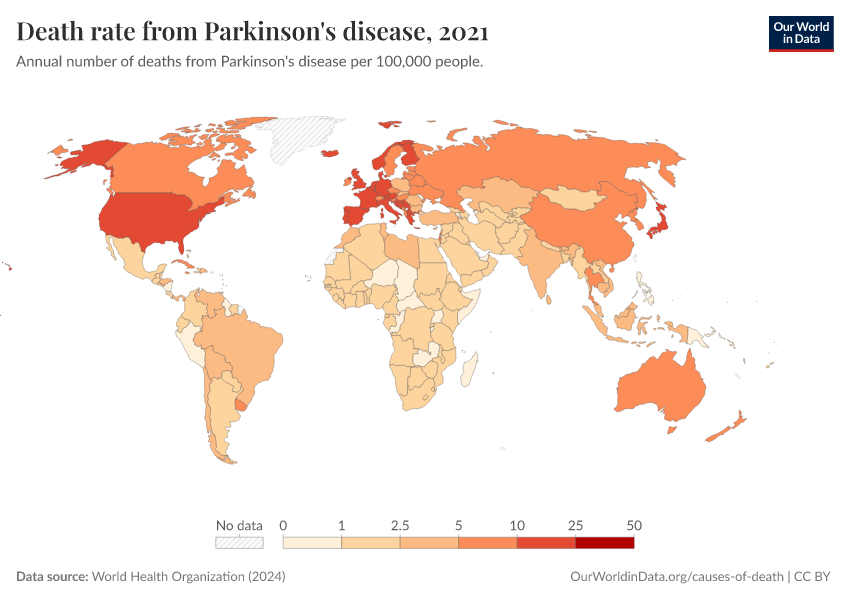 World Health Organization (2024) – with major processing by Our World in Data. “Death rate from Parkinson's disease” [dataset]. World Health Organization, “Global Health Estimates” [original data]. Retrieved February 27, 2026 from https://data-populationgrowth-discre.owid.pages.dev:8789/20250909-093708/grapher/death-rate-from-parkinsons-disease-ghe.html (archived on September 9, 2025).