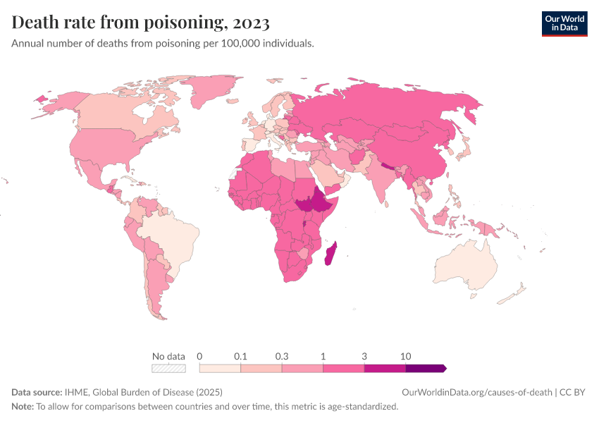“Data Page: Death rate from poisoning”, part of the following publication: Esteban Ortiz-Ospina and Max Roser (2016) - “Global Health”. Data adapted from IHME, Global Burden of Disease. Retrieved from https://data-populationgrowth-discre.owid.pages.dev:8789/20260211-174736/grapher/death-rate-from-poisoning.html [online resource] (archived on February 11, 2026).How to cite this data