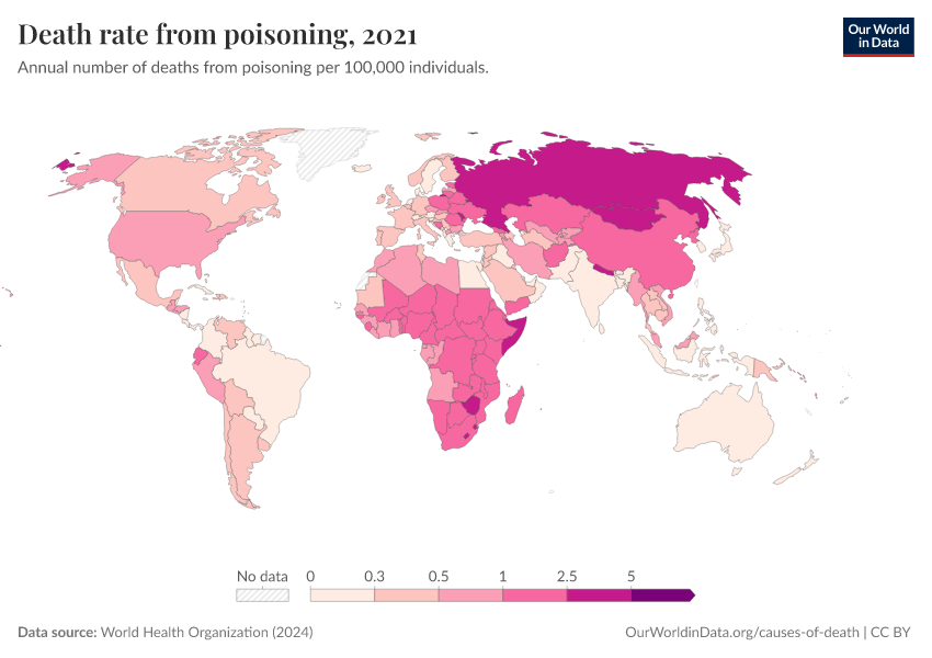World Health Organization (2024) – with major processing by Our World in Data. “Death rate from poisoning” [dataset]. World Health Organization, “Global Health Estimates” [original data]. Retrieved February 27, 2026 from https://data-populationgrowth-discre.owid.pages.dev:8789/20250909-093708/grapher/death-rate-from-poisoning-ghe.html (archived on September 9, 2025).