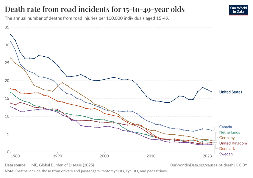 IHME, Global Burden of Disease (2025) – with major processing by Our World in Data. “Death rate from road incidents for 15-to-49-year olds” [dataset]. IHME, Global Burden of Disease, “Global Burden of Disease - Deaths” [original data]. Retrieved February 27, 2026 from https://data-populationgrowth-discre.owid.pages.dev:8789/20260211-174736/grapher/death-rate-from-road-accidents-for-15--to-49-year-olds.html (archived on February 11, 2026).