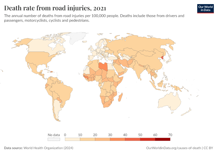 World Health Organization (2024) – with major processing by Our World in Data. “Death rate from road injuries” [dataset]. World Health Organization, “Global Health Estimates” [original data]. Retrieved February 27, 2026 from https://data-populationgrowth-discre.owid.pages.dev:8789/20250909-093708/grapher/death-rate-from-road-accidents-ghe.html (archived on September 9, 2025).