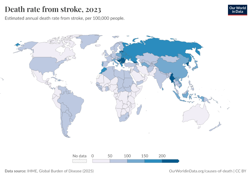 IHME, Global Burden of Disease (2025) – with major processing by Our World in Data. “Death rate from stroke” [dataset]. IHME, Global Burden of Disease, “Global Burden of Disease - Deaths” [original data]. Retrieved February 27, 2026 from https://data-populationgrowth-discre.owid.pages.dev:8789/20260211-174736/grapher/death-rate-from-strokes.html (archived on February 11, 2026).