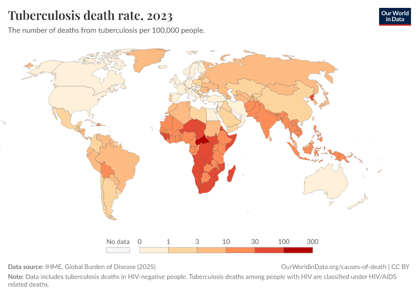 “Data Page: Tuberculosis death rate”, part of the following publication: Esteban Ortiz-Ospina and Max Roser (2016) - “Global Health”. Data adapted from IHME, Global Burden of Disease. Retrieved from https://data-populationgrowth-discre.owid.pages.dev:8789/20260211-174736/grapher/death-rate-from-tuberculosis-gbd.html [online resource] (archived on February 11, 2026).How to cite this data