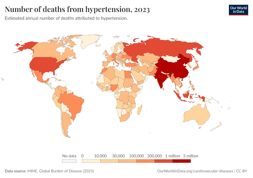 IHME, Global Burden of Disease (2025) – with major processing by Our World in Data. “Number of deaths from hypertension” [dataset]. IHME, Global Burden of Disease, “Global Burden of Disease - Risk Factors - Deaths” [original data]. Retrieved February 27, 2026 from https://data-populationgrowth-discre.owid.pages.dev:8789/20260213-112438/grapher/deaths-due-to-high-blood-pressure.html (archived on February 13, 2026).