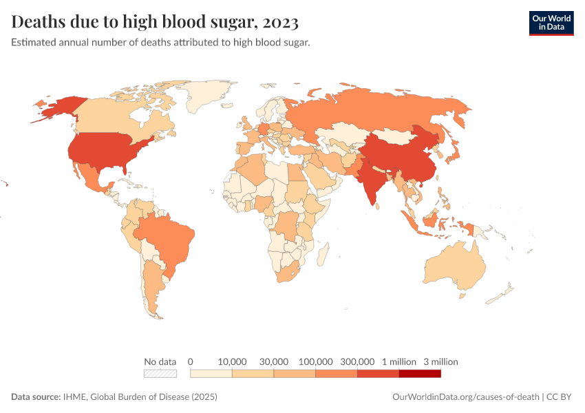 IHME, Global Burden of Disease (2025) – with major processing by Our World in Data. “Deaths due to high blood sugar” [dataset]. IHME, Global Burden of Disease, “Global Burden of Disease - Risk Factors - Deaths” [original data]. Retrieved February 27, 2026 from https://data-populationgrowth-discre.owid.pages.dev:8789/20260213-112438/grapher/deaths-due-to-high-blood-sugar.html (archived on February 13, 2026).