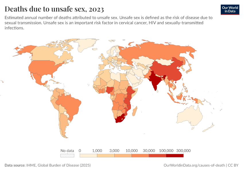 IHME, Global Burden of Disease (2025) – with major processing by Our World in Data. “Deaths due to unsafe sex” [dataset]. IHME, Global Burden of Disease, “Global Burden of Disease - Risk Factors - Deaths” [original data]. Retrieved February 27, 2026 from https://data-populationgrowth-discre.owid.pages.dev:8789/20260213-112438/grapher/deaths-due-to-unsafe-sex.html (archived on February 13, 2026).