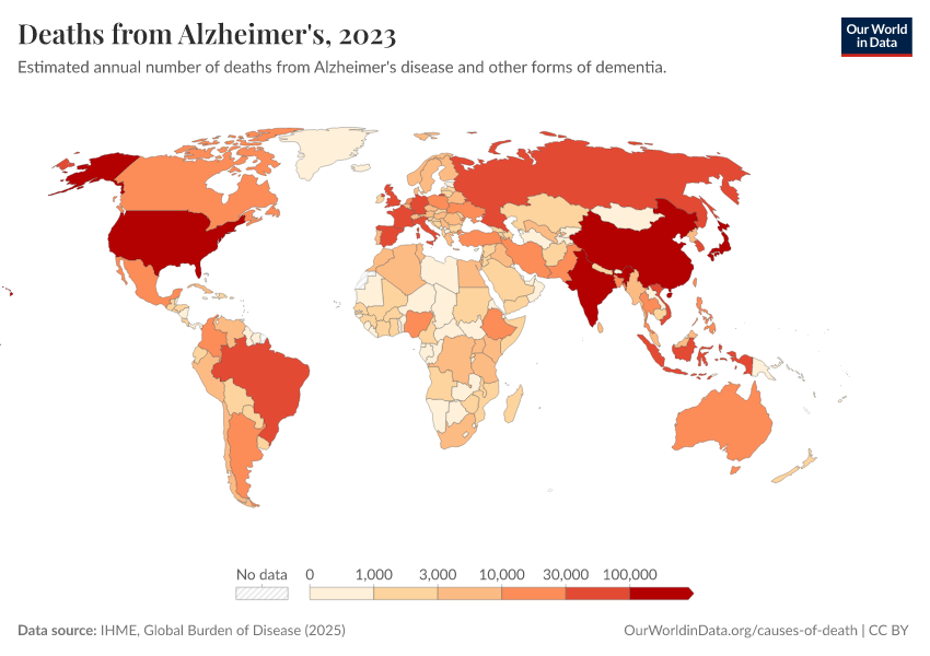 IHME, Global Burden of Disease (2025) – with major processing by Our World in Data. “Deaths from Alzheimer's” [dataset]. IHME, Global Burden of Disease, “Global Burden of Disease - Deaths” [original data]. Retrieved February 27, 2026 from https://data-populationgrowth-discre.owid.pages.dev:8789/20260211-174736/grapher/deaths-from-alzheimers.html (archived on February 11, 2026).