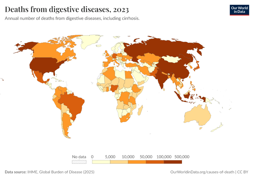IHME, Global Burden of Disease (2025) – with major processing by Our World in Data. “Deaths from digestive diseases” [dataset]. IHME, Global Burden of Disease, “Global Burden of Disease - Deaths” [original data]. Retrieved February 27, 2026 from https://data-populationgrowth-discre.owid.pages.dev:8789/20260211-174736/grapher/deaths-from-digestive-diseases.html (archived on February 11, 2026).