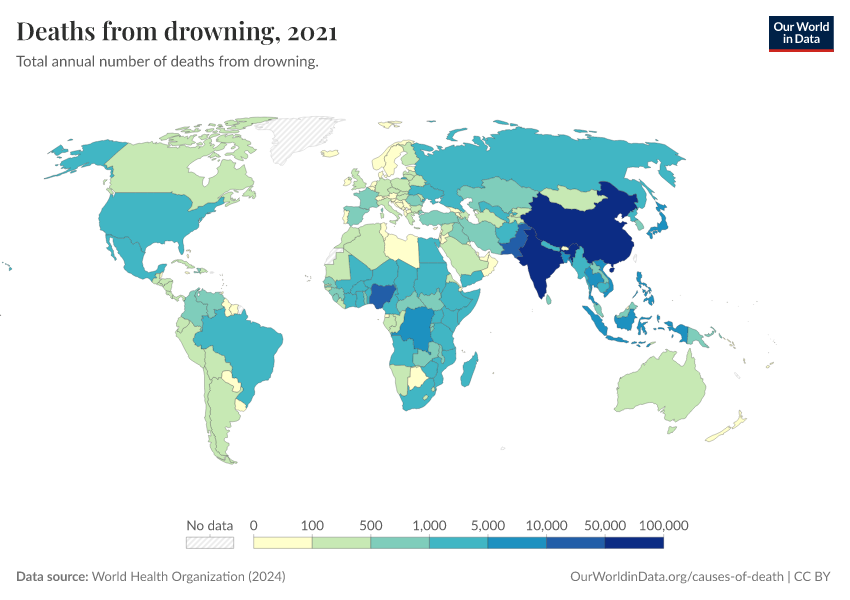 World Health Organization (2024) – with major processing by Our World in Data. “Deaths from drowning” [dataset]. World Health Organization, “Global Health Estimates” [original data]. Retrieved February 27, 2026 from https://data-populationgrowth-discre.owid.pages.dev:8789/20250909-093708/grapher/deaths-from-drowning-ghe.html (archived on September 9, 2025).