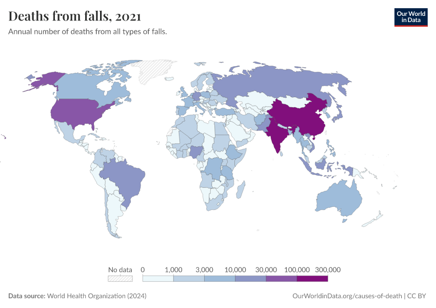 World Health Organization (2024) – with major processing by Our World in Data. “Deaths from falls” [dataset]. World Health Organization, “Global Health Estimates” [original data]. Retrieved February 27, 2026 from https://data-populationgrowth-discre.owid.pages.dev:8789/20250909-093708/grapher/deaths-from-falls.html (archived on September 9, 2025).